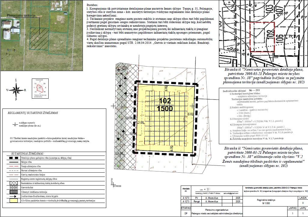 Planuojama teritorija: Nemirsetos gyvenvietės detaliojo plano, patvirtinto 2000-03-21 Palangos miesto tarybos sprendimu Nr. 38, koregavimas (koreguojant užstatymo ribą ir zoną sklype detaliajame plane pažymėtą Nr. 102, adresu Tuopų g. 31, Palangoje, sklypo kad. nr. 2501/0038:139).