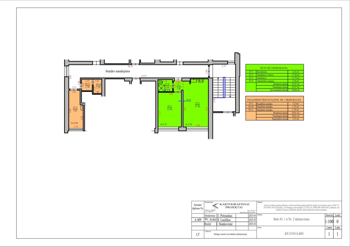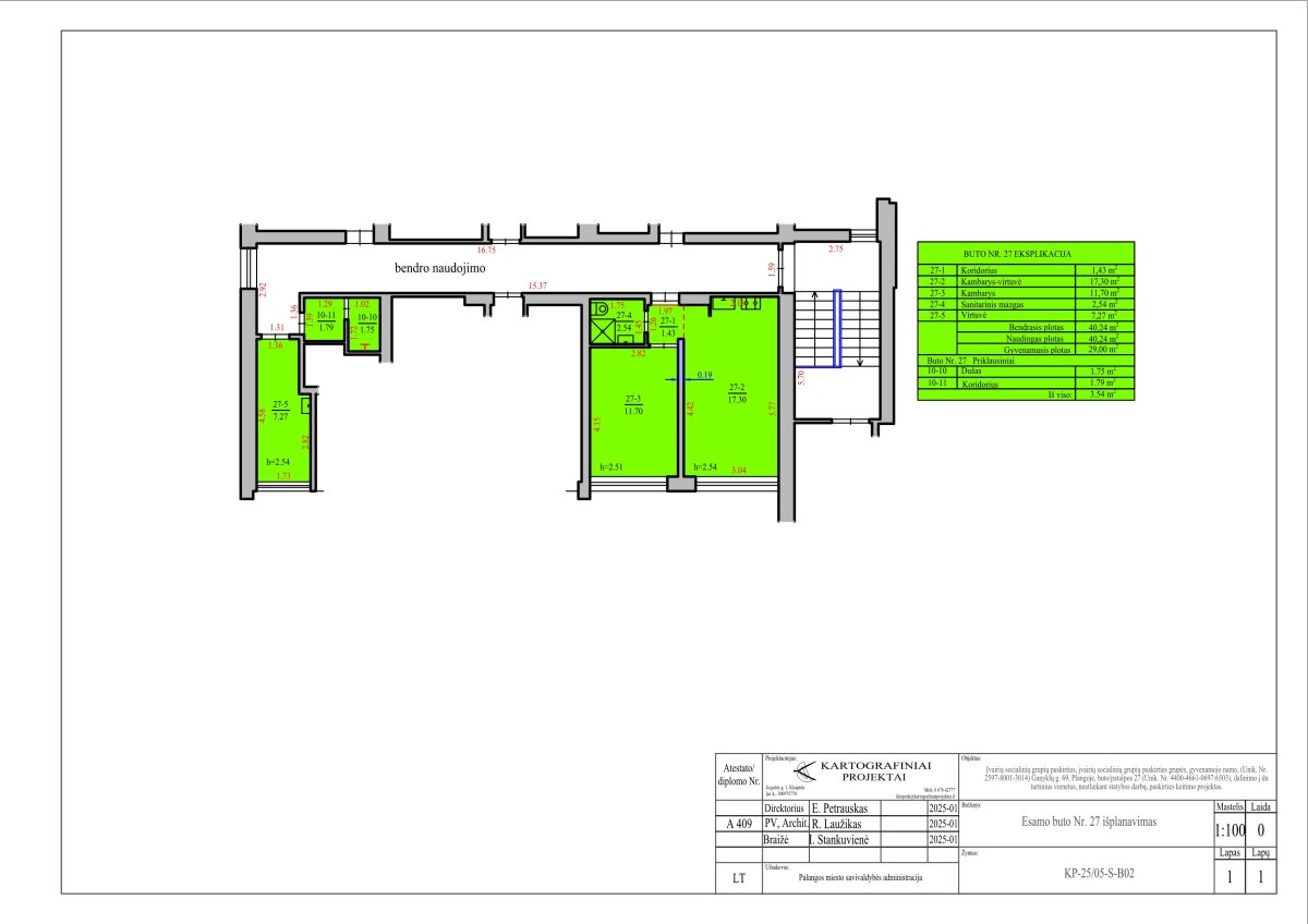 Įvairių socialinių grupių paskirties, įvairių socialinių grupių paskirties grupės, gyvenamojo namo, (Unik. Nr. 2597-8001-3014) Ganyklų g. 69, Plangoje, buto/patalpos 27 (Unik. Nr. 4400-4661-0697:6503), dalinimo į du turtinius vienetus, neatliekant statybos darbų, paskirties keitimo projektas.